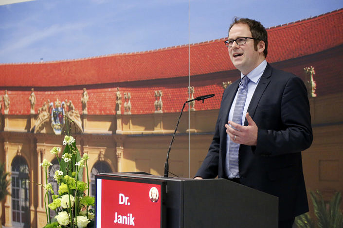 The Dean of the Faculty of Medicine, Prof. Dr. Dr. h.c. J. Schüttler, heartily welcomed all present and gave an short overview on the life and work of Jakob Herz. He greeted the awardee in French and congratulated her on her success, pointing out her cooperation with the Faculty in the field of oncology. The President of the FAU, Prof. Dr. J. Hornegger, emphasized the translational aspect of research at and within FAU. He was very happy that a woman received the prize this year. The Mayor of Erlangen, Dr. F. Janik, remembered how important it is for Erlangen and FAU that this prize is a permanent one as both parties should always remember their inglorious behavior during the Nazi regime. For him, the prize is both, an award and a political symbol, showing that Erlangen has learned its lesson. Prof. Dr. A. Mackensen, Director of the Department of Medicine 5, has been knowing the laureate for more than 20 years and holds her enthusiasm and engagement for her research in estimation. This enthusiasm clearly became apparent for the audience during Prof. Zitvogel’s vivid presentation.